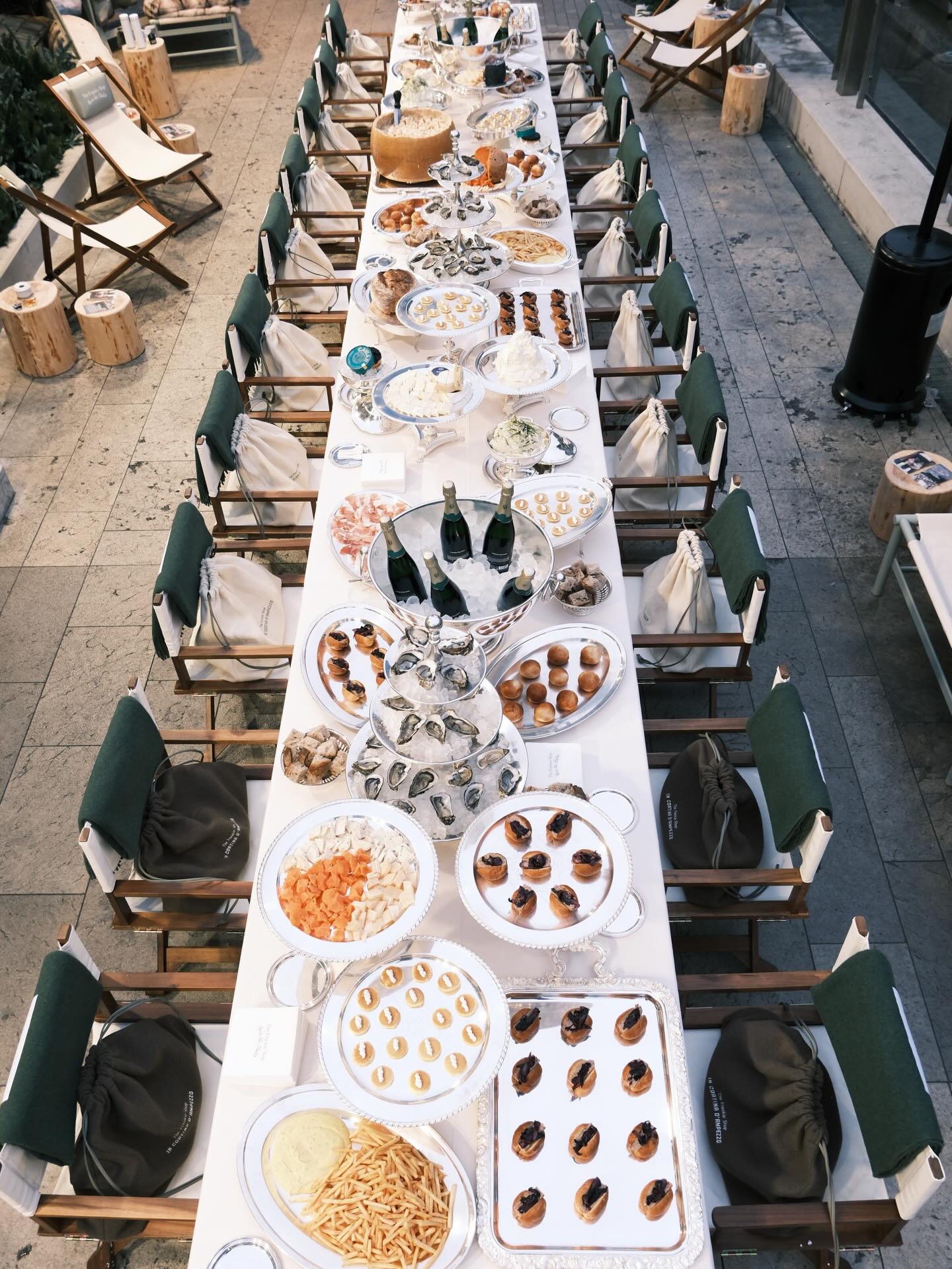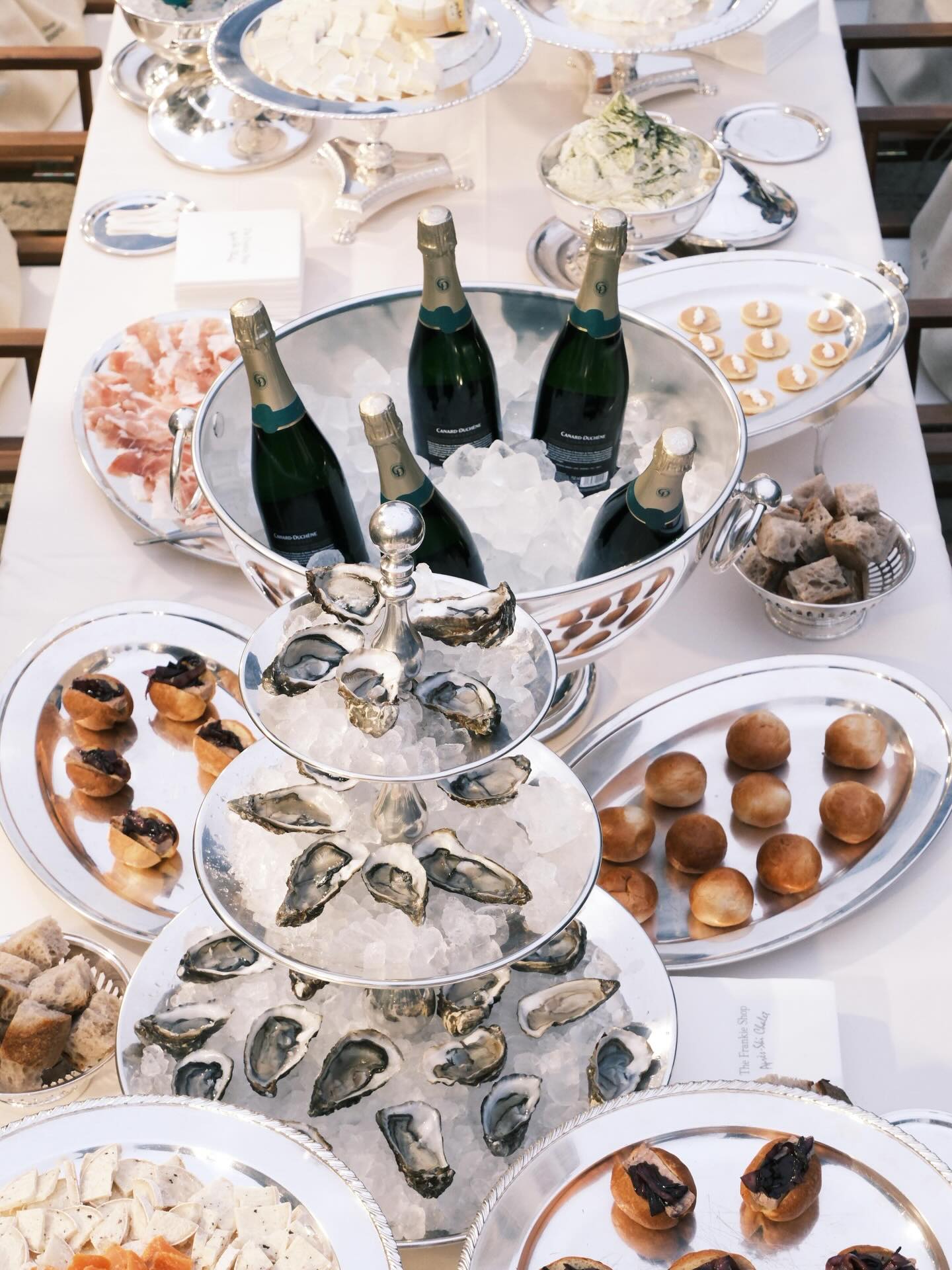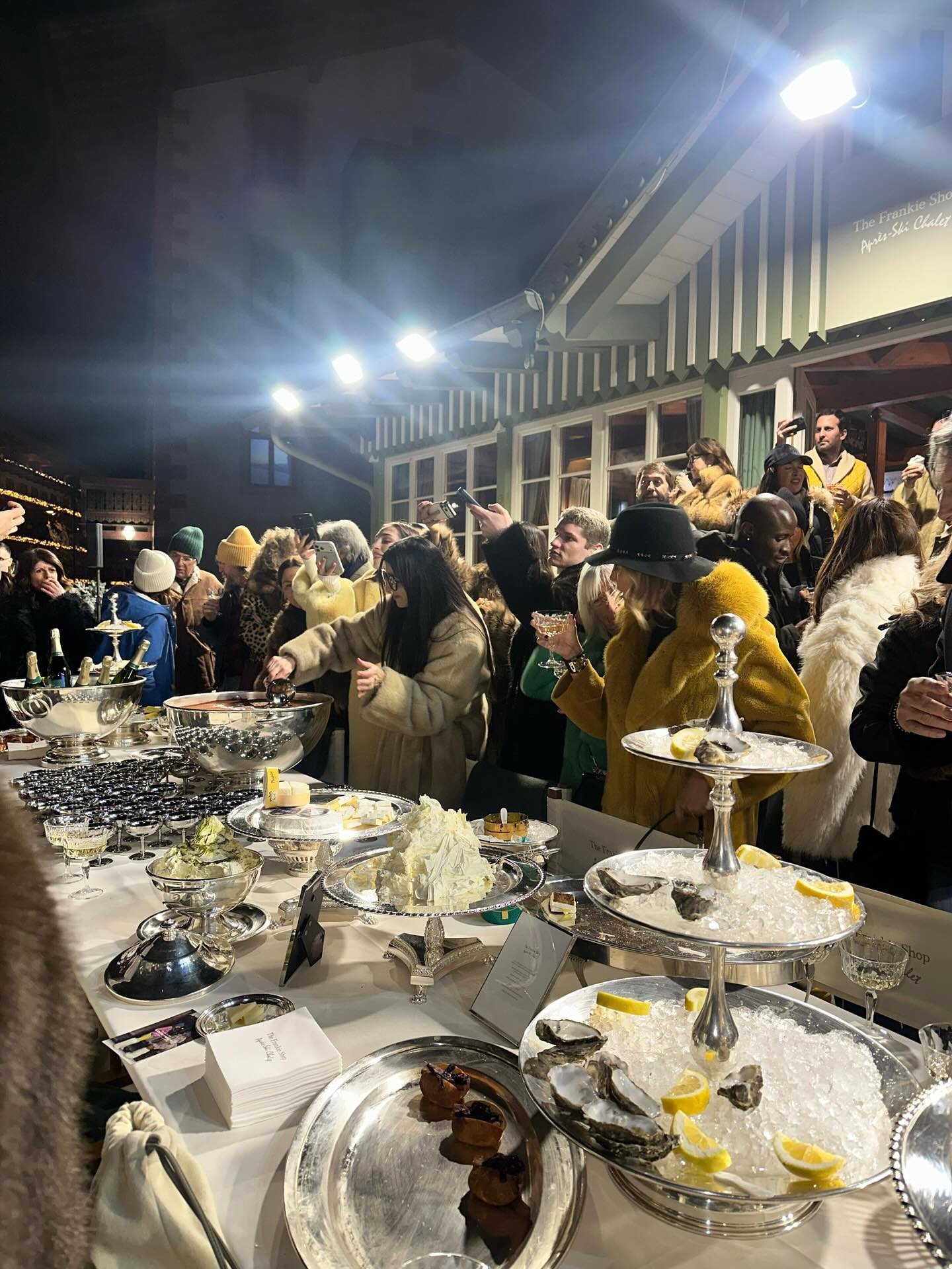 E poi il catering, perché lo stile passa anche dal palato. Caviale, ostriche, frites e champagne rigorosamente servito in coppa, come da tradizione. Ma il vero colpo di scena è arrivato con il dessert, una glassette monumentale porta bottiglie di champagne, trasformata in supporto scenografico per un tiramisù iconico, decorato con il nome della capsule e il logo The Frankie Shop, disegnati dal contrasto elegante della polvere di cacao.